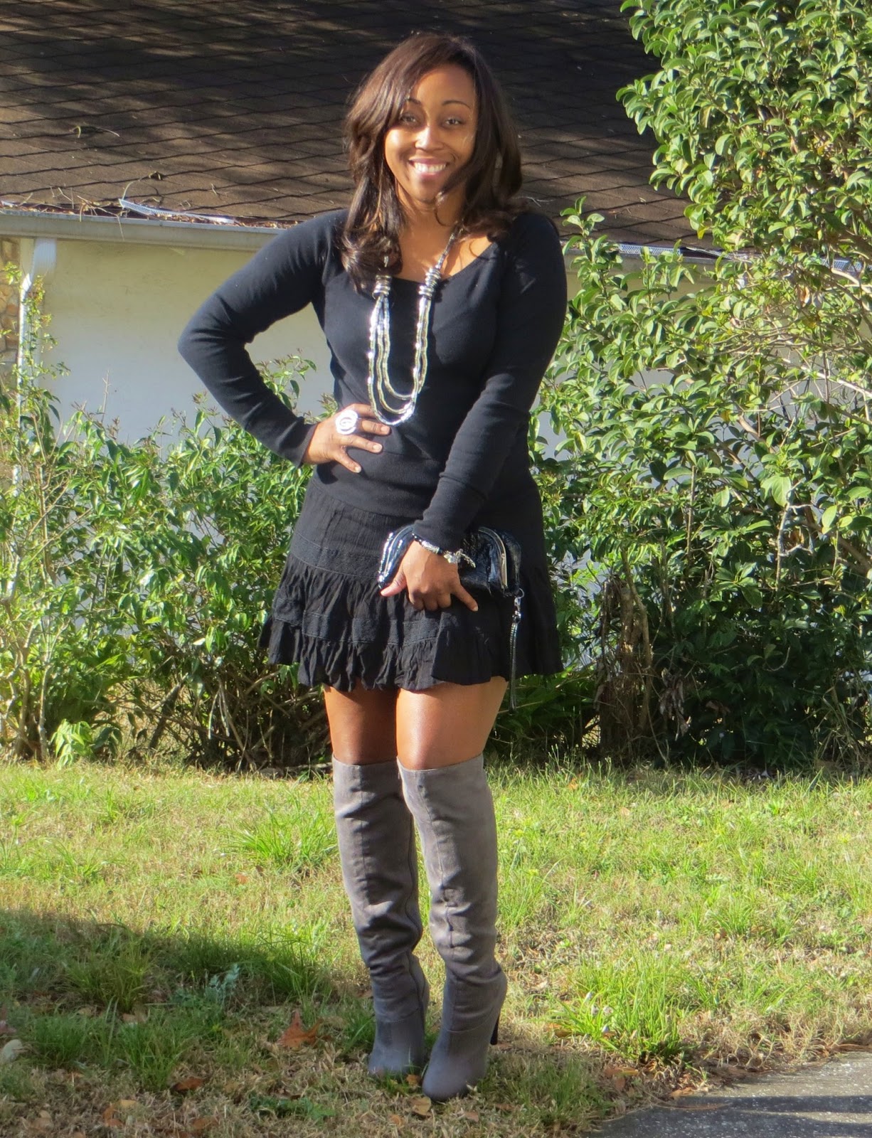 I finally had a chance to wear my new boots. They fit like a pair of leggings so I had to wear a mini skirt or dress with them. I obviously chose the skirt combo....